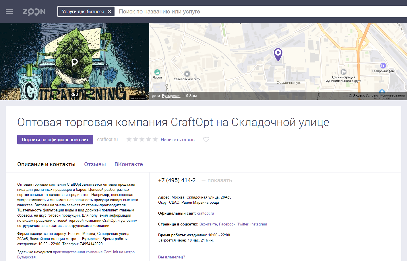 Многие современные каталоги дают возможность подробно рассказать о компании. Например, профиль в zoon.ru больше напоминает продающий лендинг, что замечательно повлияет на репутацию компании, ее узнаваемость и в последующем рост продаж.