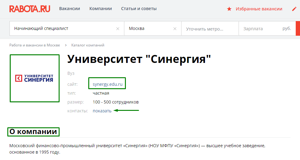 Сайты поиска работы предоставляют более узкий формат профиля. Главное, чтобы в нем присутствовало фактическое или юридическое название компании, лого, сайт, актуальные контактные данные и краткое описание деятельности.