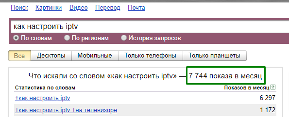Анализ запроса “как настроить iptv” в Яндекс.Вордстат