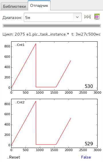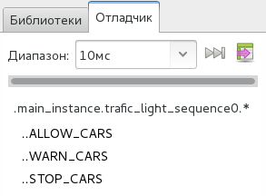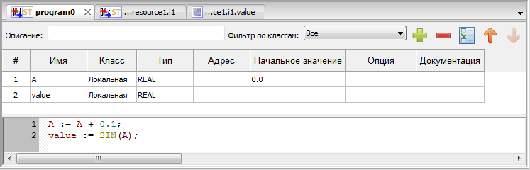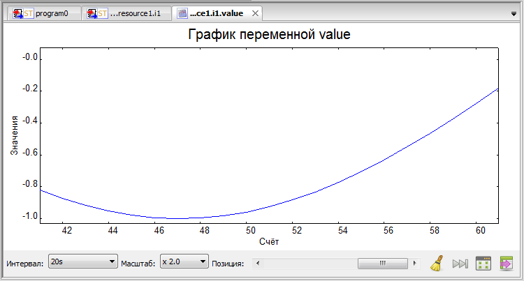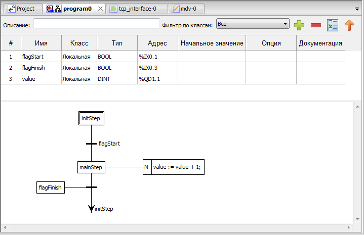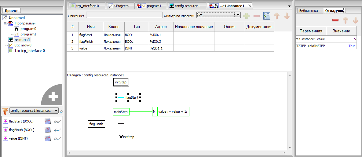 Блок действий, ассоциированный с этим шагом, также становится и активным и выделен зелёным цветом. Единственное действие начинает выполняться. Следовательно, в панели отладки видно, как значение переменной «value» увеличивается на единицу с периодичностью в 500 миллисекунд, т.к. экземпляр программы «program0» связан с задачей, у которой интервал 500 мс (см. п. 10.6).