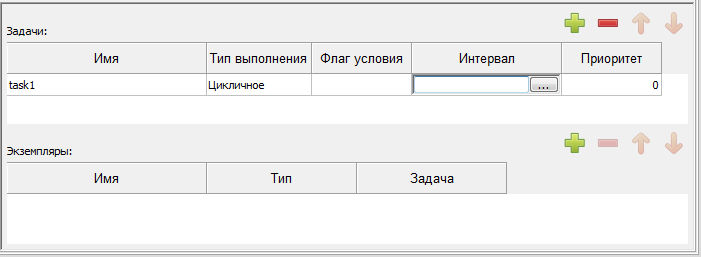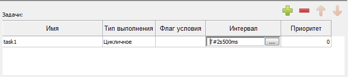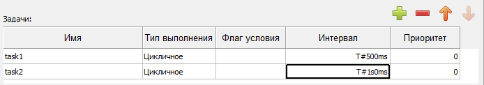 В появившейся панели необходимо добавить две задачи с типом выполнения «Цикличное», одна из которых продолжительностью 500 мс, а другая 1000 мс. С помощью кнопки добавить (данная кнопка аналогична кнопки добавления переменной в панели переменных и констант) добавляется задача, поле «Тип выполнения» устанавливается «Цикличное» и делается двойной щелчок по полю «Интервал» (см. рис. 246).