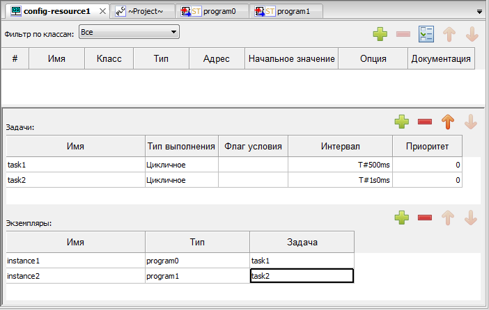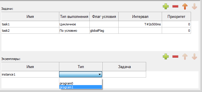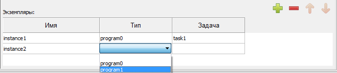 Далее создаётся два экземпляра: «instance1» и «instance2». Данная операция осуществляется аналогичным образом, используя кнопку добавления экземпляра. Каждый из добавленных экземпляров ассоциируется с программным модулем типа «Программа» (соответственно «program0» и «program1»), используя поле «Тип» и с задачей (соответственно «task1» и «task2»), используя поле «Задача» (см. рис. 249).