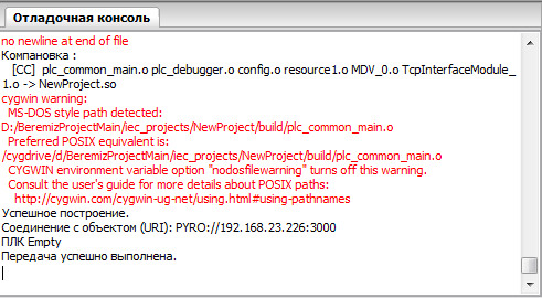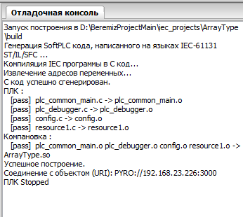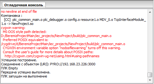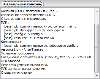 В отладочной консоли будет выдано соответствующее сообщение «ПЛК запущен на выполнение», показанное на рис. 259: