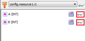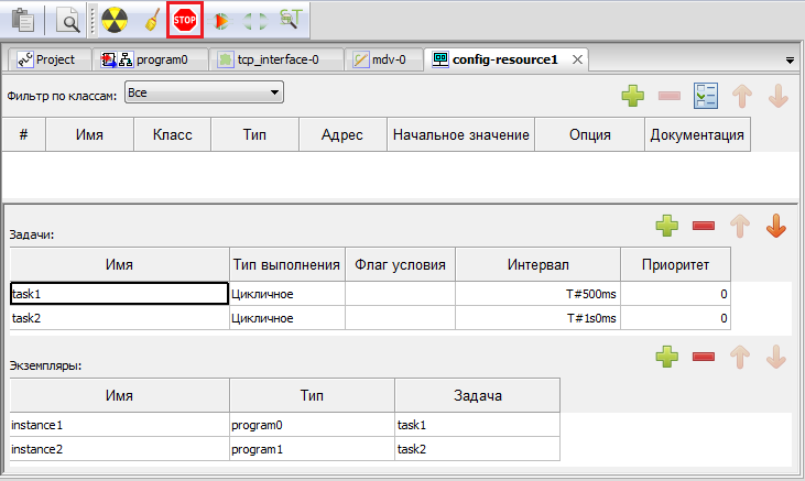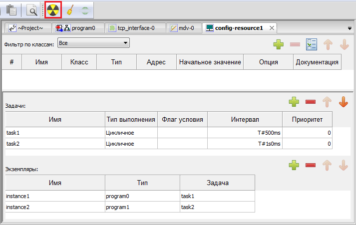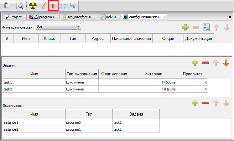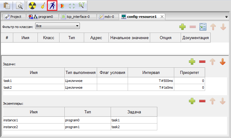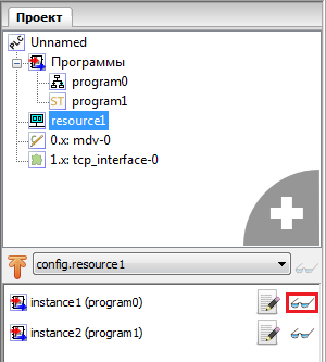 После того как прикладная программа запущена, можно обратиться к дереву проекта и выбрать элемент «resource1». В панели экземпляров будут отображены два экземпляра, определённых в ресурсе «resource»: «instance1» для «program0» и «instance2» для «program1». Если нажать кнопку запуска режима отладки для экземпляра, выделенную на рис. 262 красным цветом для «instance1»: