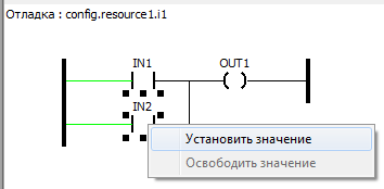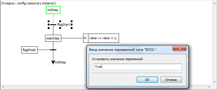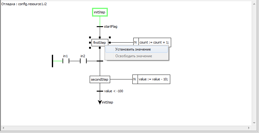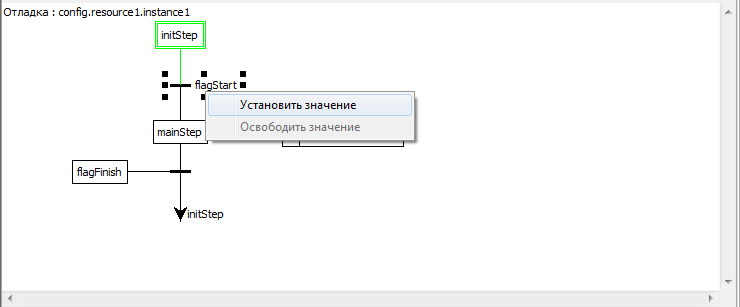 Значение переменной «value» равно 0, т.к. это значение присвоено ей при инициализации. Для того, чтобы значение начало изменяться необходимо сделать шаг «mainStep» активным. Это может произойти, если в модуле «МДВ-У» 1-ый сигнал станет TRUE, т.к. переход «flagStart», зависит именно от него. Другим способом перевести переход «flagStart» в состояние TRUE является механизм отладки SFC диаграммы. Для этого на SFC диагрмме необходимо нажать правой кнопкой мыши по переходу «flagStart» и выбрать «Установить значение» в появившемся всплывающем меню, как показано на рис. 265.
