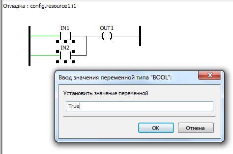 В появившемся диалоге «Ввода значения переменной типа “BOOL”» устанавливается значение «True». Далее следует нажатие кнопки «OK», как показано на рис. 266.