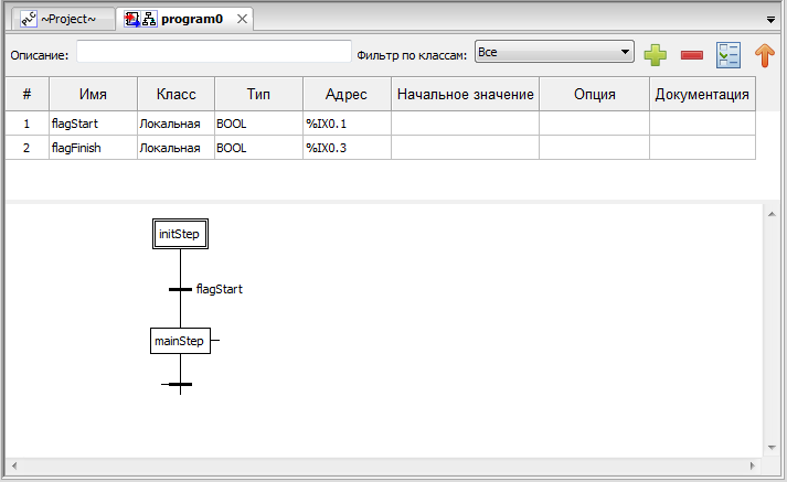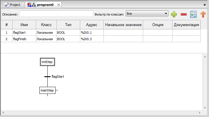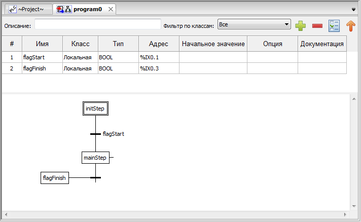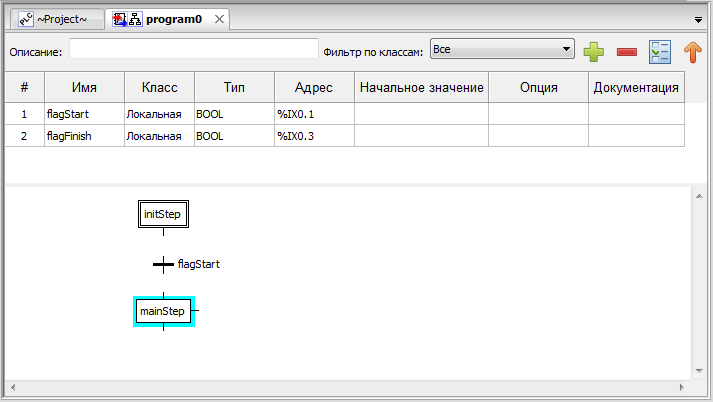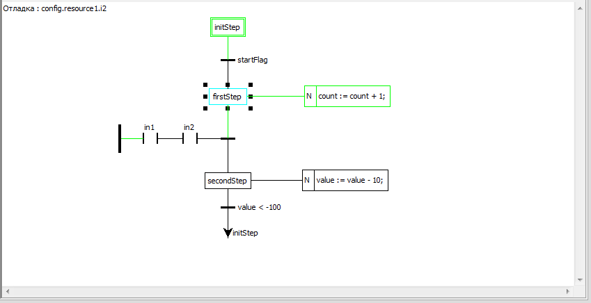 Соответственно, после установки перехода «flagStart» на SFC диаграмме в значение TRUE, шаг «mainStep» выделен зелёным цветом (см. рис. 267).