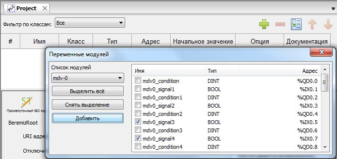 Плагин для модуля УСО – интерфейс, состоящий из специальных драйверов и элементов пользовательского интерфейса для среды разработки «Beremiz», позволяющий связывать переменные модулей УСО с переменными программных модулей, из которых состоит проект.