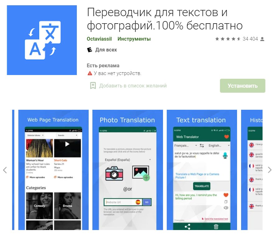 5. «Переводчик для текстов и фотографий. 100% бесплатно»