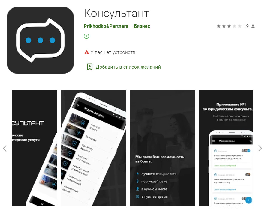 Приложение «Консультант» было запущено в Украине в 2019 году, оно разработано для предпринимателей и частных лиц, нуждающихся в помощи по юридическим и бухгалтерским вопросам. В системе работают: